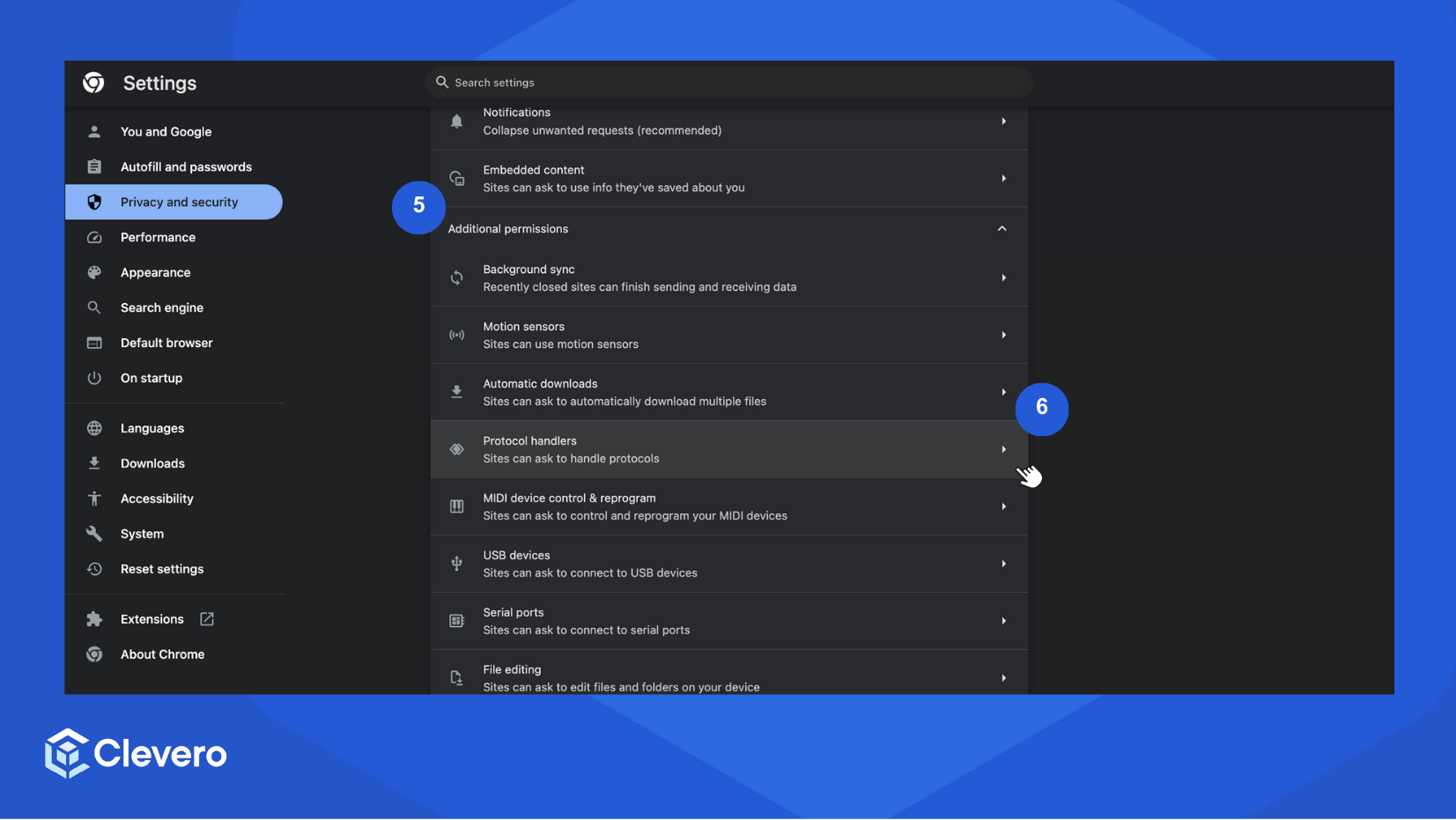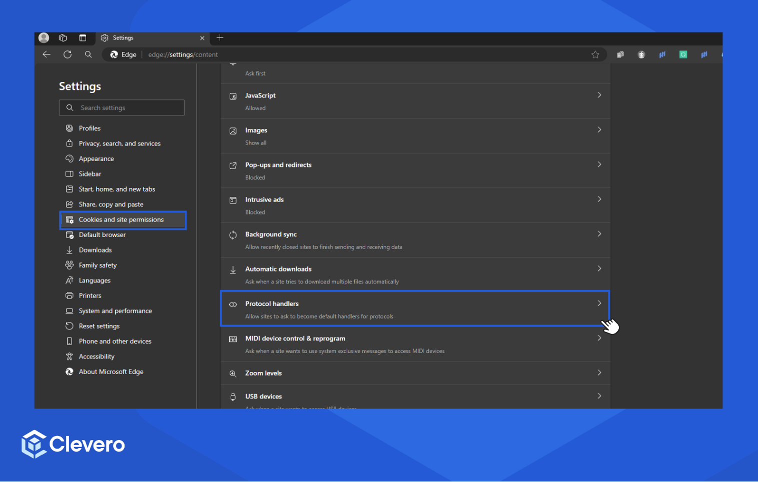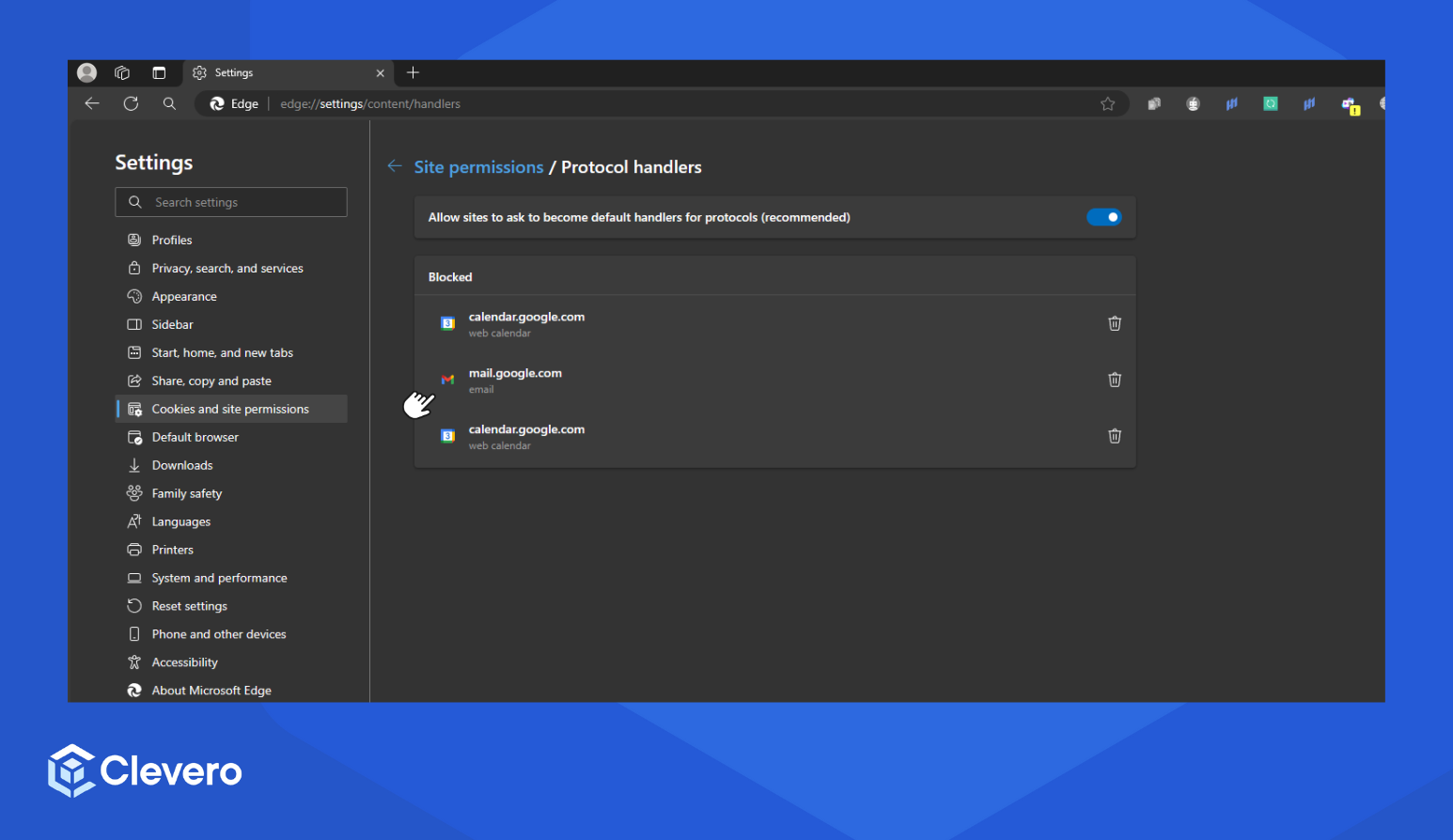 - Select Cookies and site permissions > Protocol handlers.