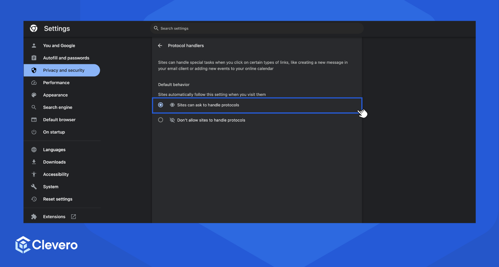 - Enable the Allow sites to ask to become default handlers for protocols option.