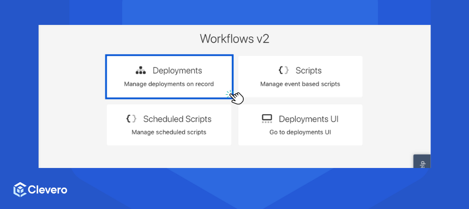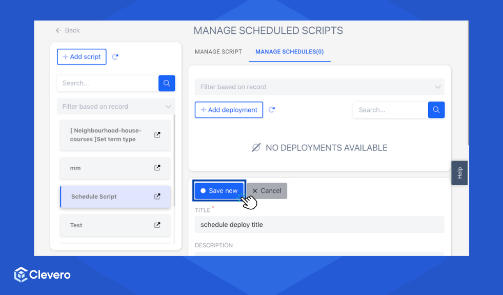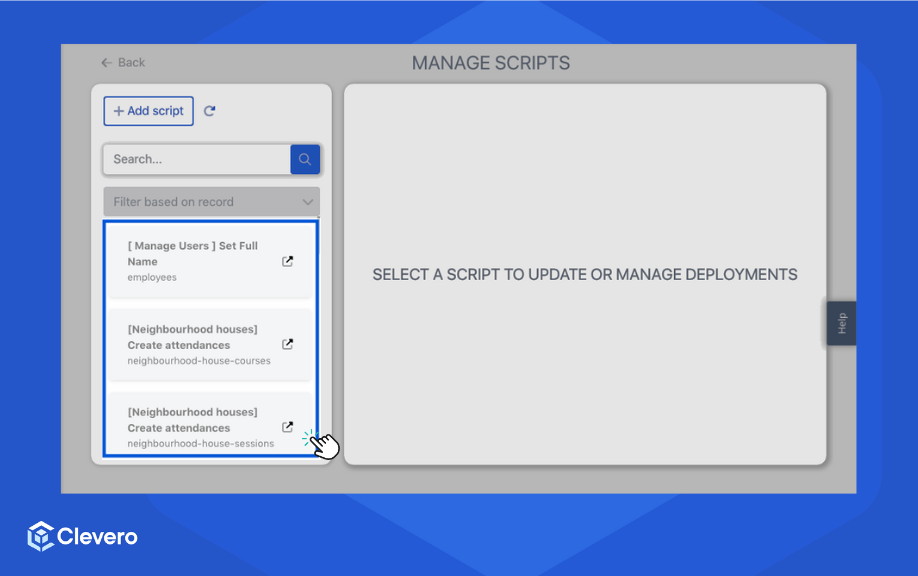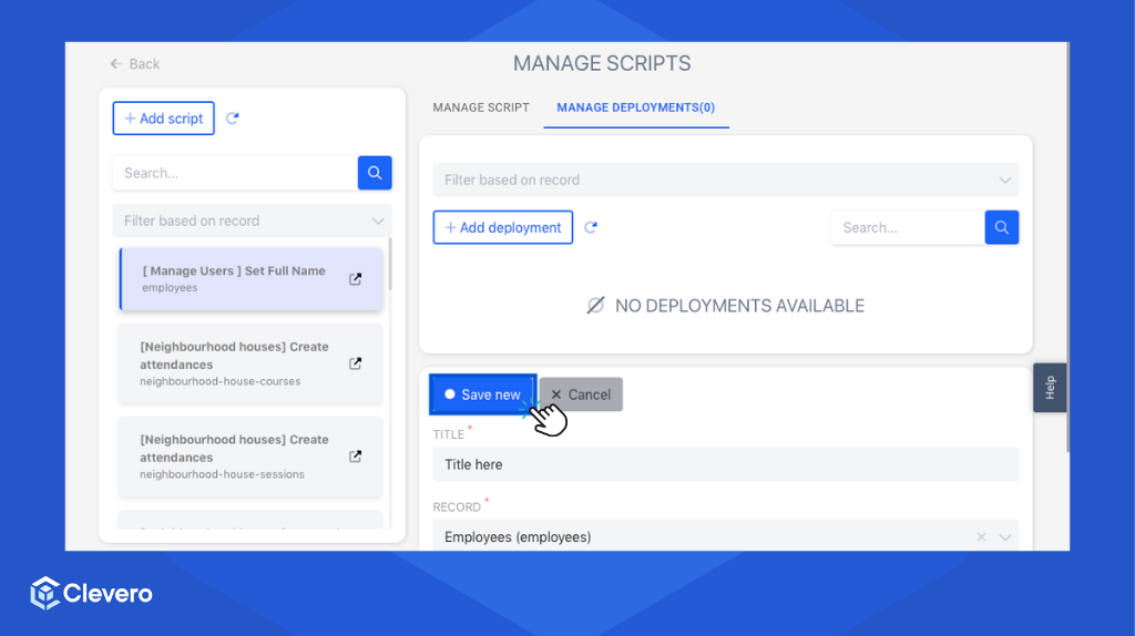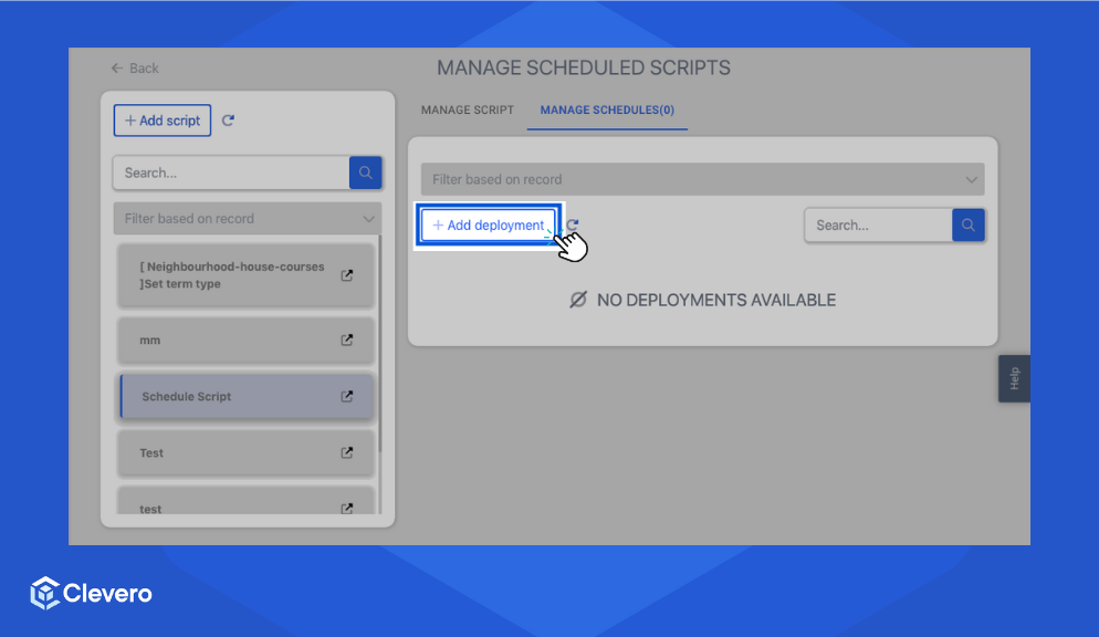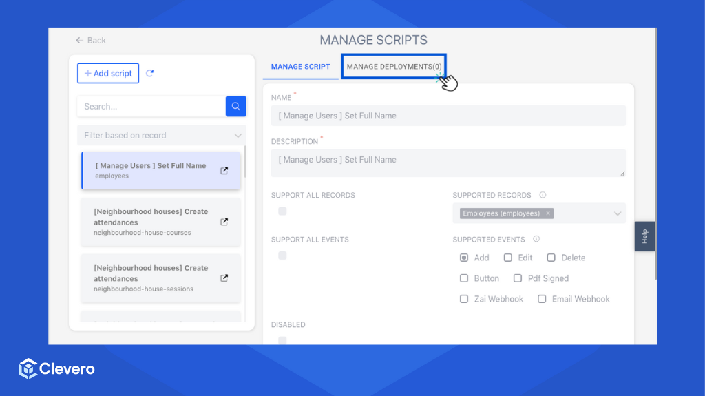 Deployment is a central hub within the Clevero system where users can manage and configure script deployments. This page enables users to control the execution of scripts based on various events and interactions within the system.