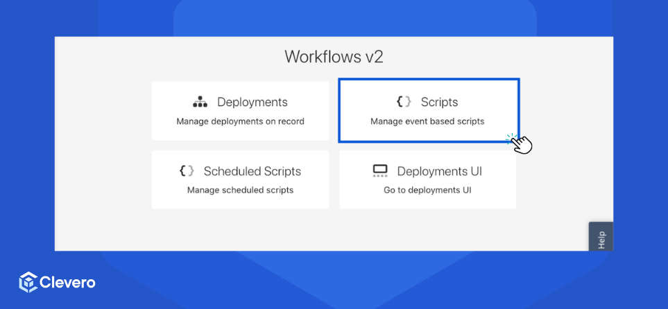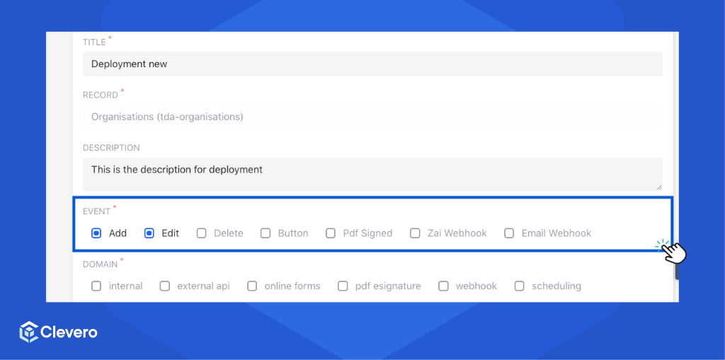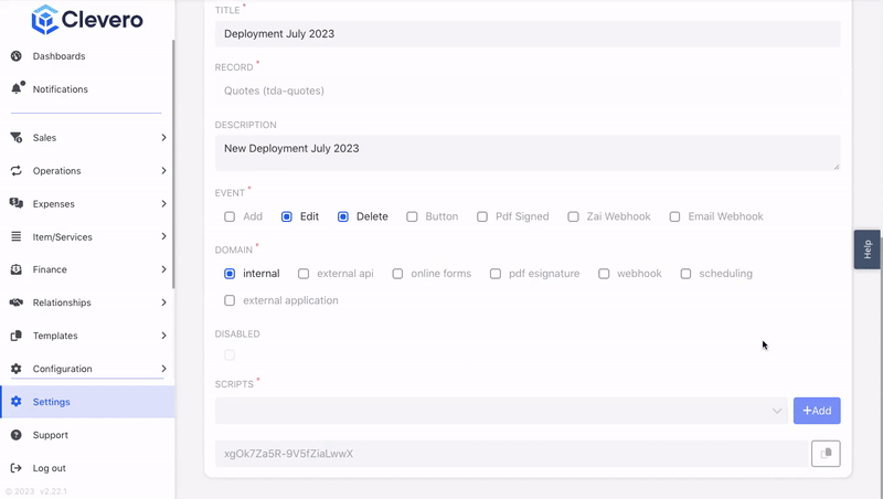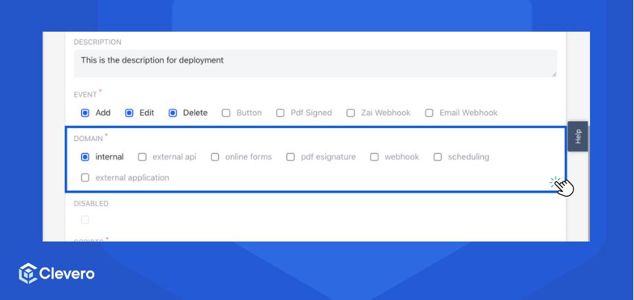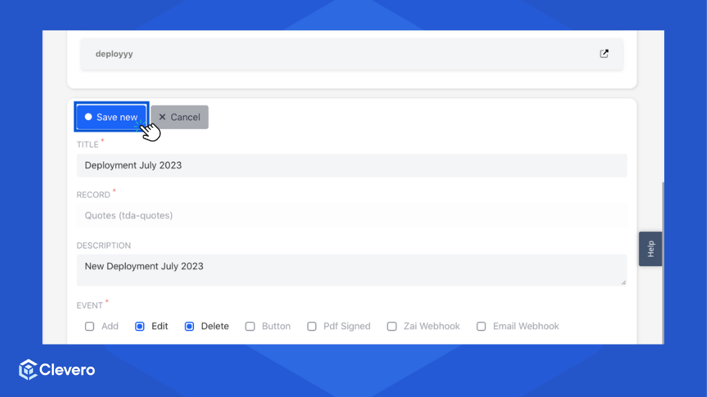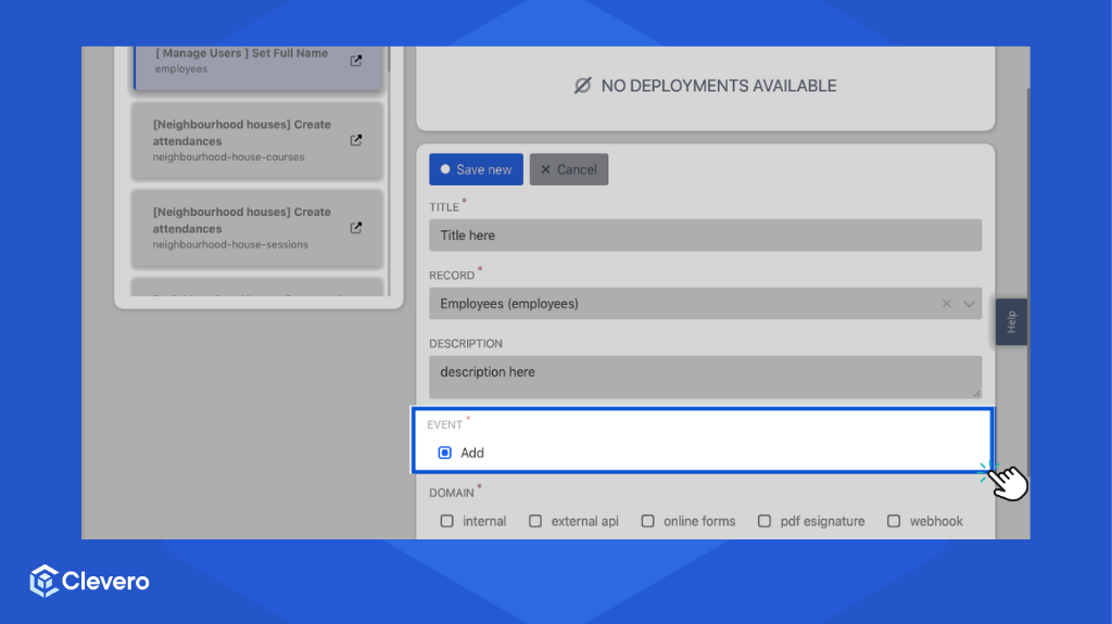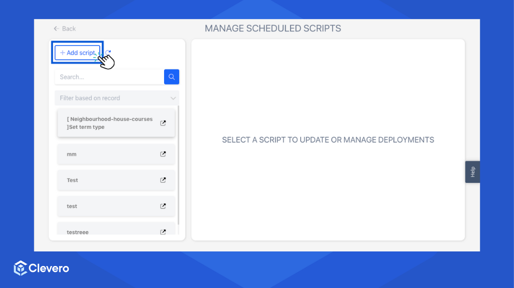 Deployment is a central hub within the Clevero system where users can manage and configure script deployments. This page enables users to control the execution of scripts based on various events and interactions within the system.