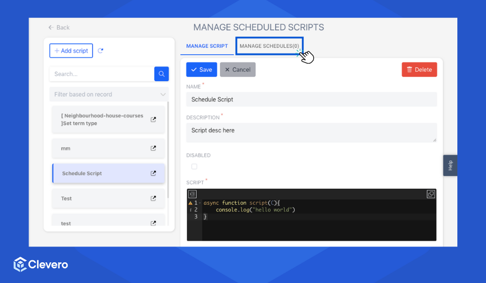 - After saving the script, switch to the "Manage Schedules" tab.