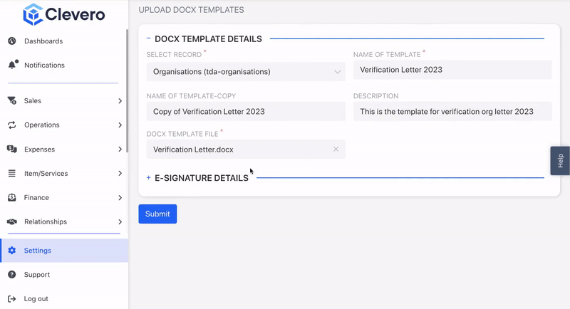 - Click the "Submit" button to save the document template.