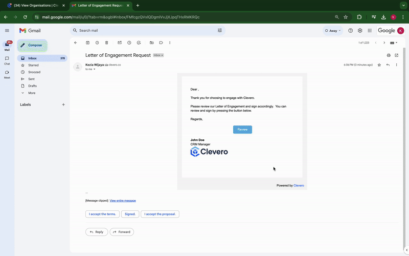 Clevero simplifies the signing process with the "eSignature Actions" feature. This feature allows you to send the document to be signed via email or by sharing a direct link.