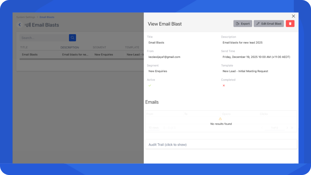 The Email Blasts feature lets you easily send scheduled or recurring emails to targeted groups of users. You can choose who receives the email, when it’s sent, and what template it uses, all in one place.