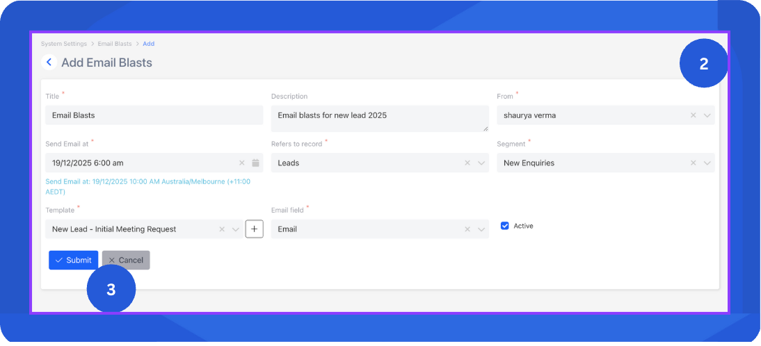 - Click Submit to save your changes. It will automatically send emails at the scheduled time to all recipients that match your selected segment.