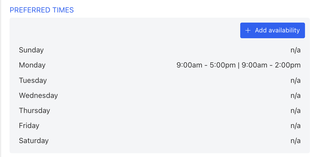 | Availability | Tracks available times or slots for booking/scheduling. | ![]() |