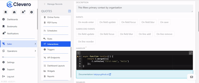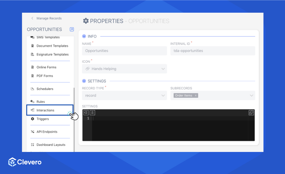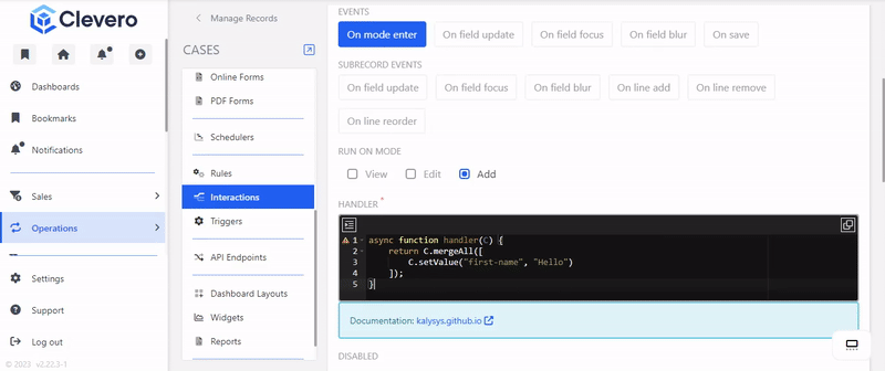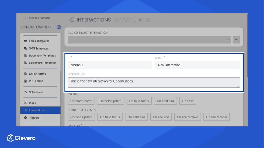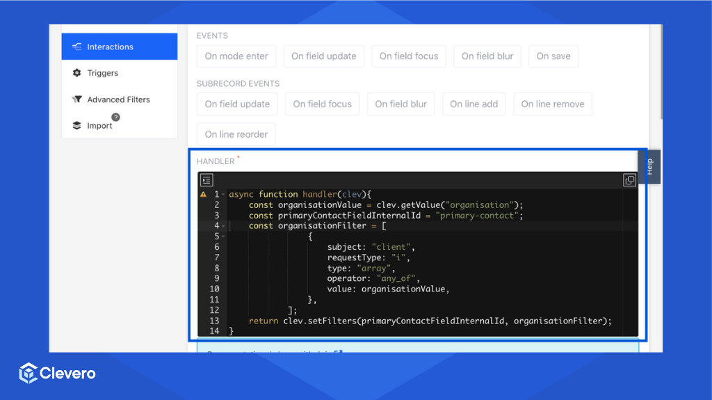 Interactions in Clevero are client-side automations that respond to how users interact with the browser in real time. They’re designed to make your Entry Layouts smarter, more dynamic, and more intuitive—without requiring complex development.