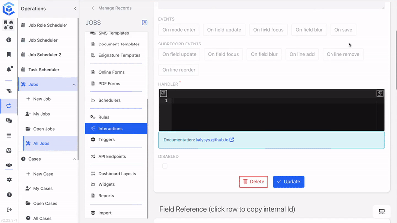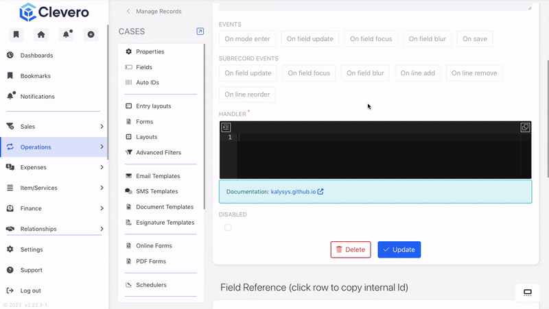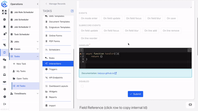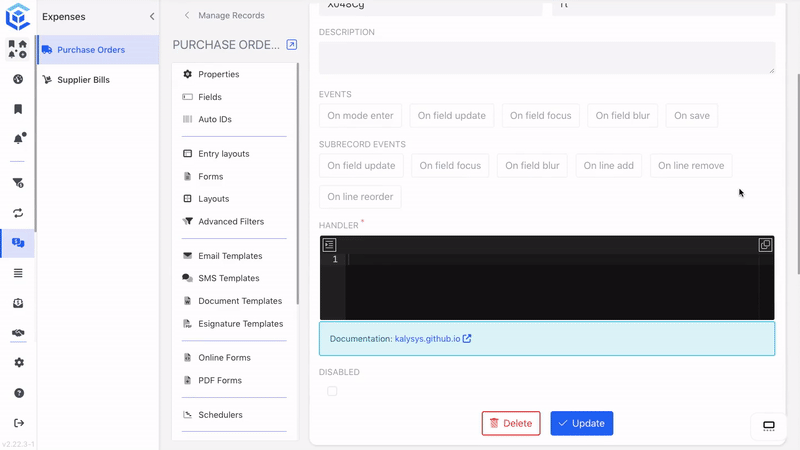 Sub Record events are similar to normal events but are fired when specific actions are performed within the record. Below are the currently supported Sub Record events: