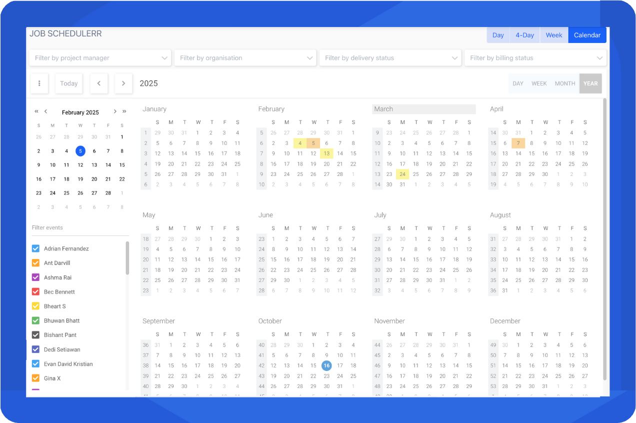 Shows events organized by week, useful for short-term planning and resource allocation.
