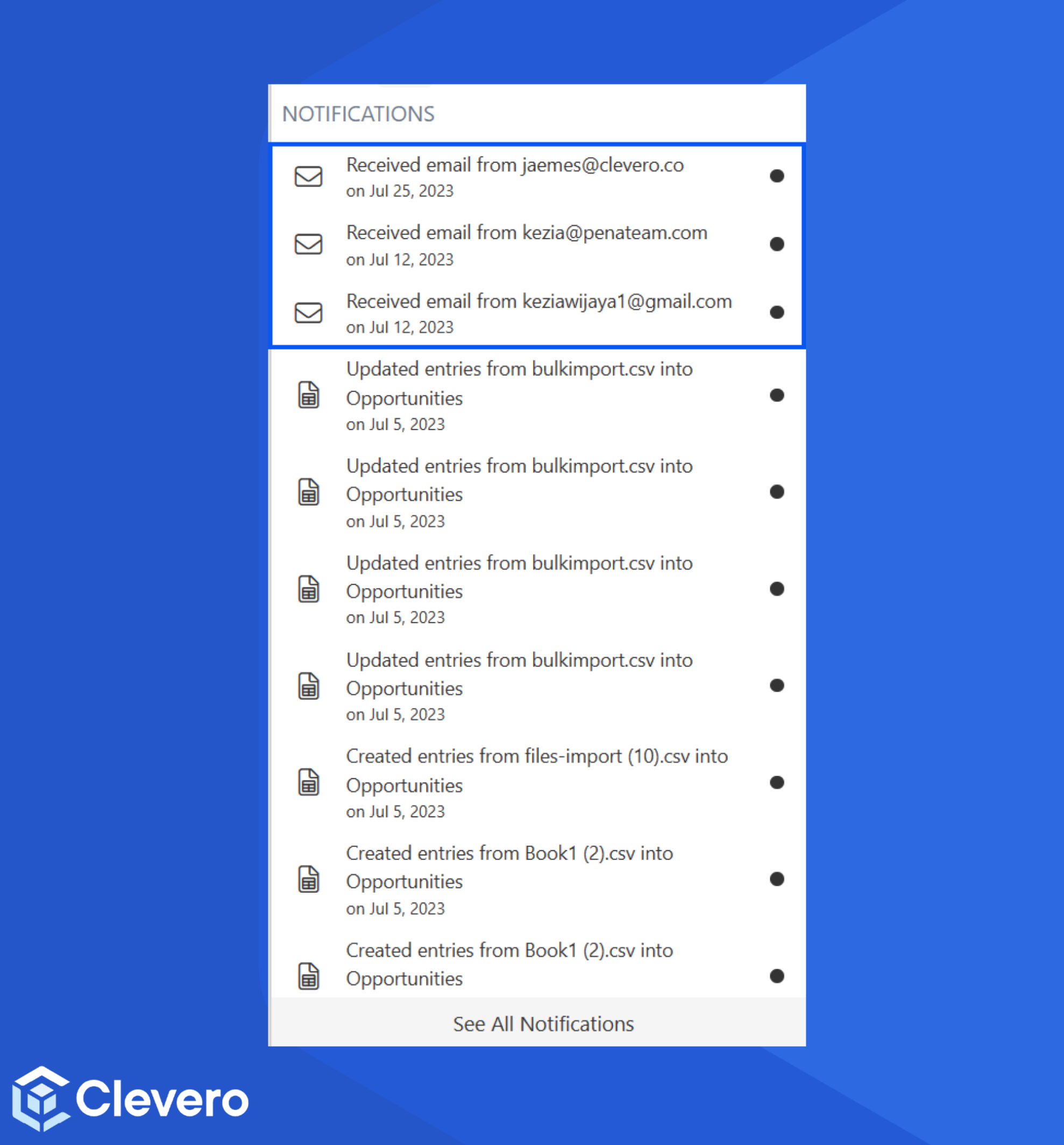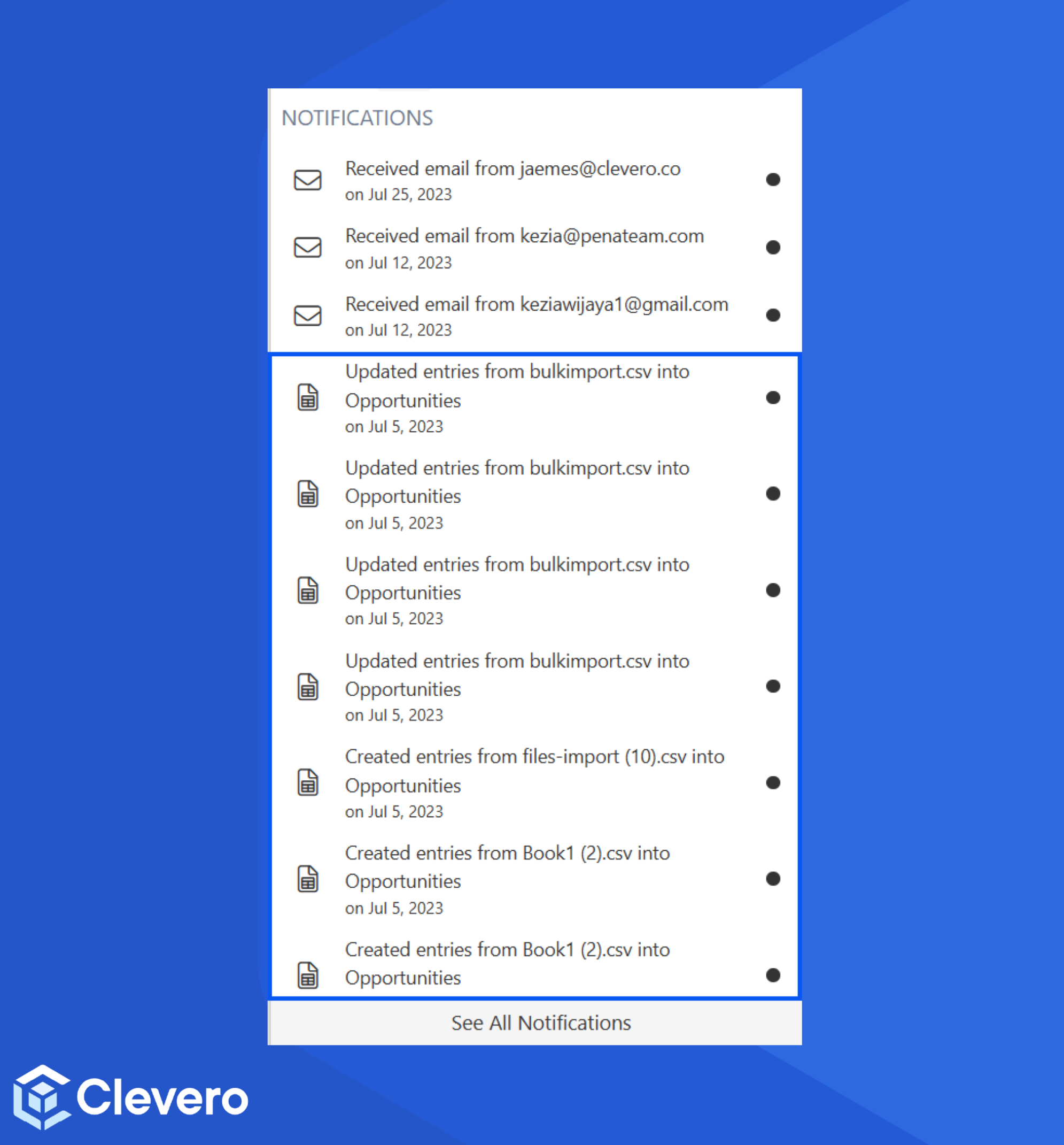 Bulk Actions notifications cover important updates that affect the entries. This includes informing users about events like CSV file imports and changes to existing entries across multiple records.