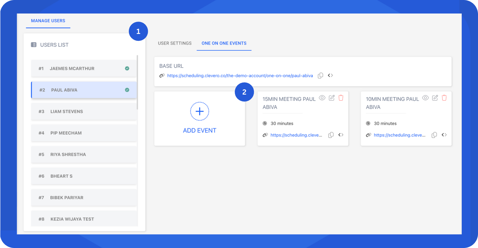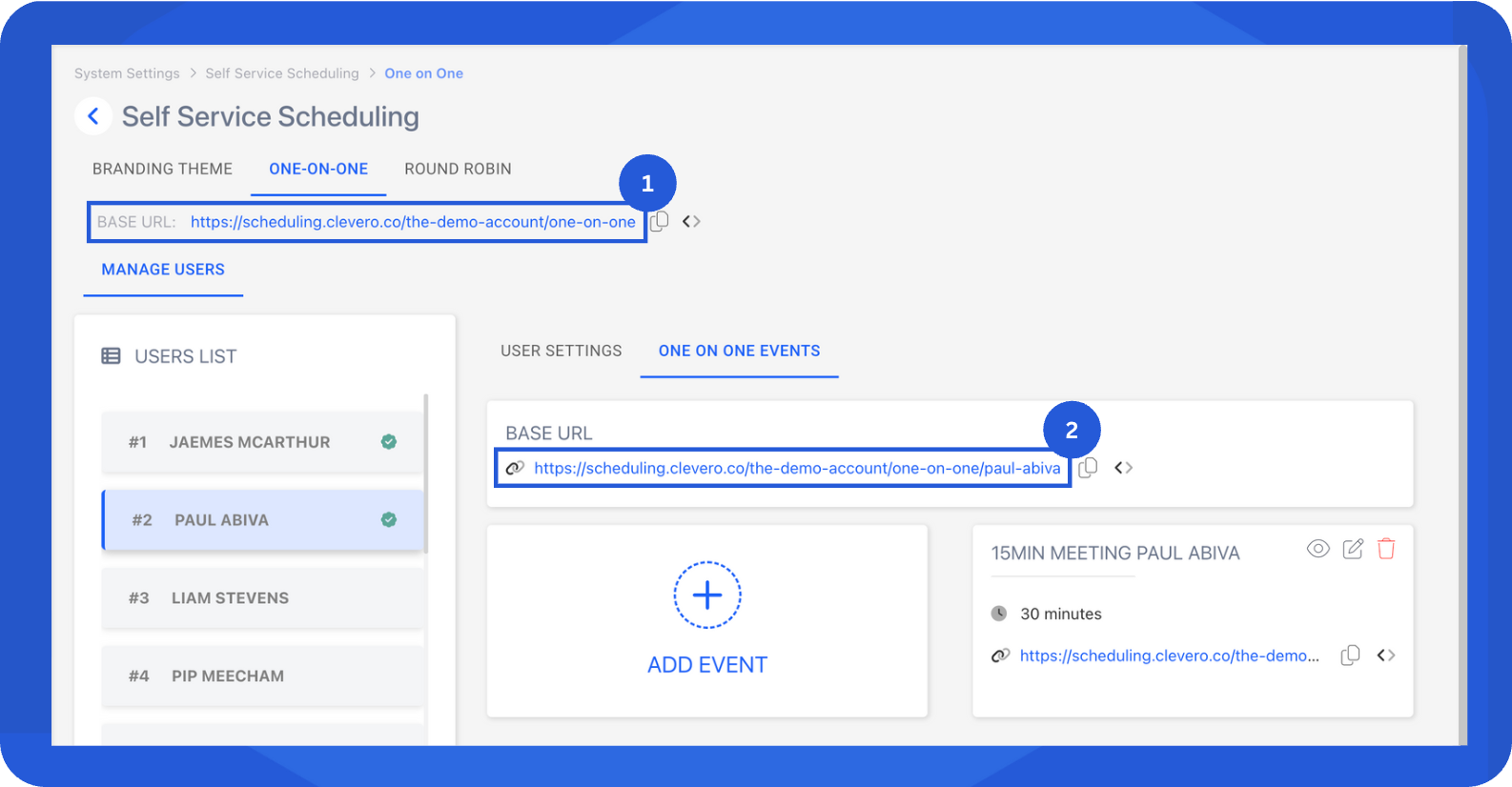 Each user has their own Base URL under the One-on-One Events tab. This link displays only that user’s available meetings. Use it when you want invitees to book directly with a specific team member.
