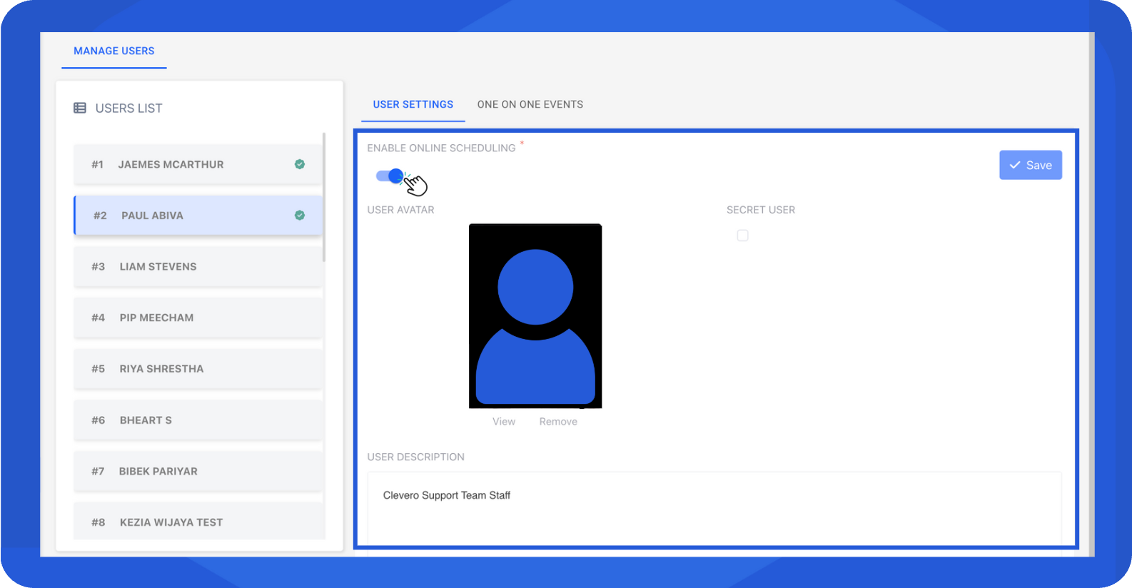- Enable the Enable Online Scheduling toggle to activate the One-on-One scheduling feature for this user.