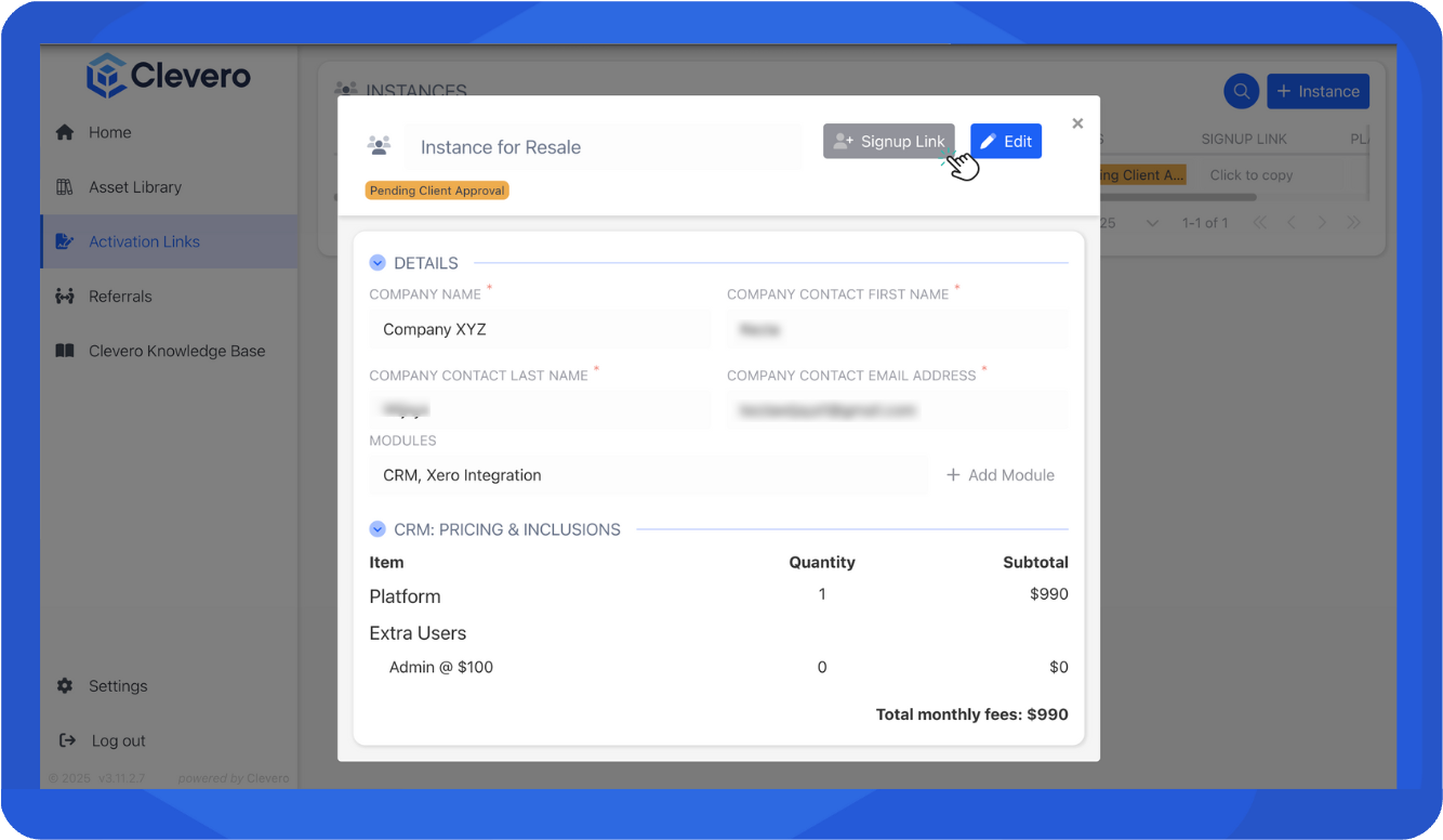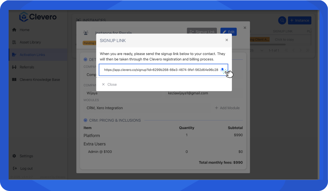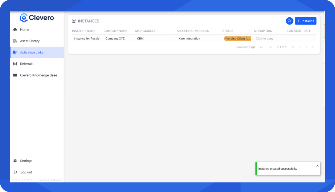 - From the Activation Links menu, select the + Instance to create a new instance.