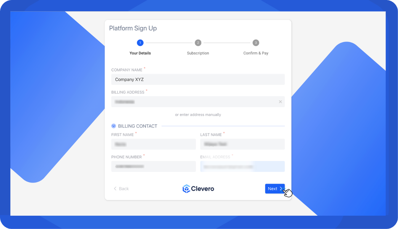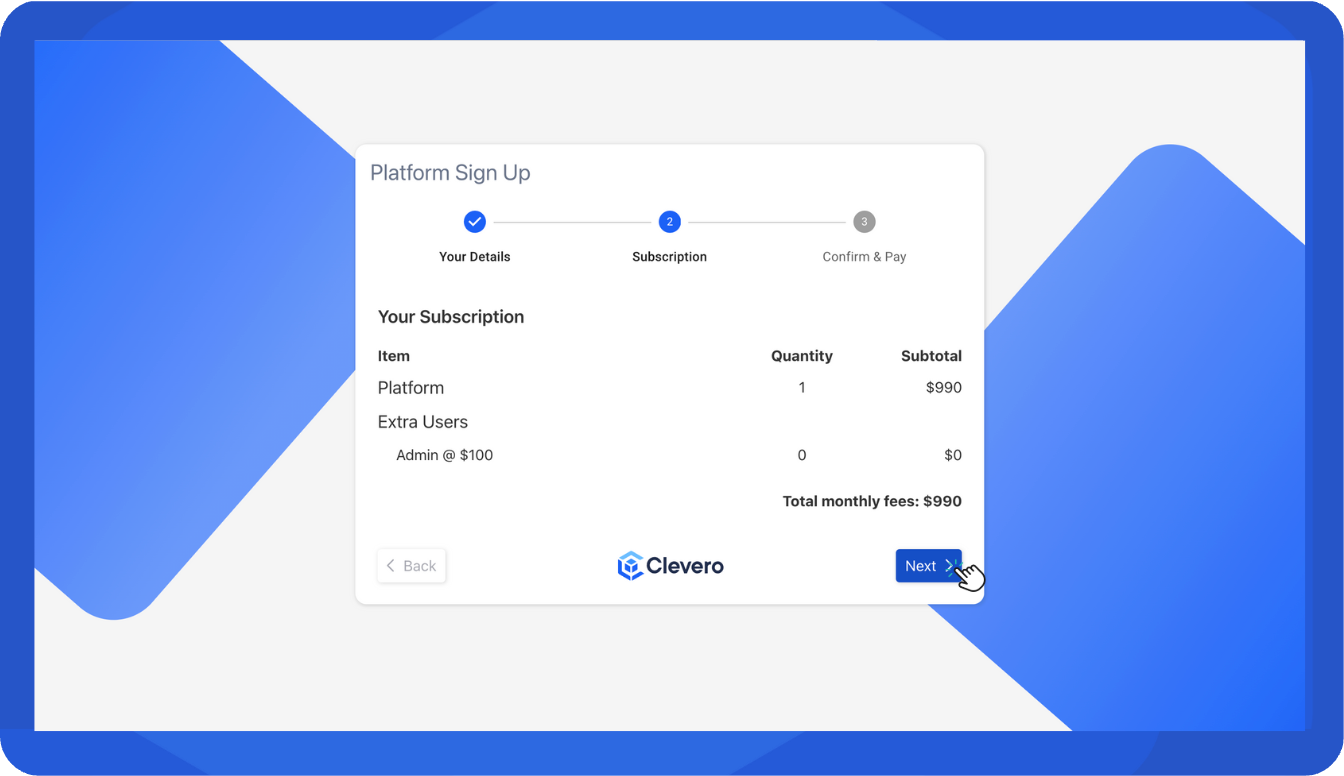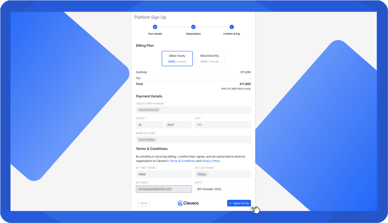 - The customer will be directed to the Clevero Registration and Billing page. They must enter their billing information and review the subscription details.