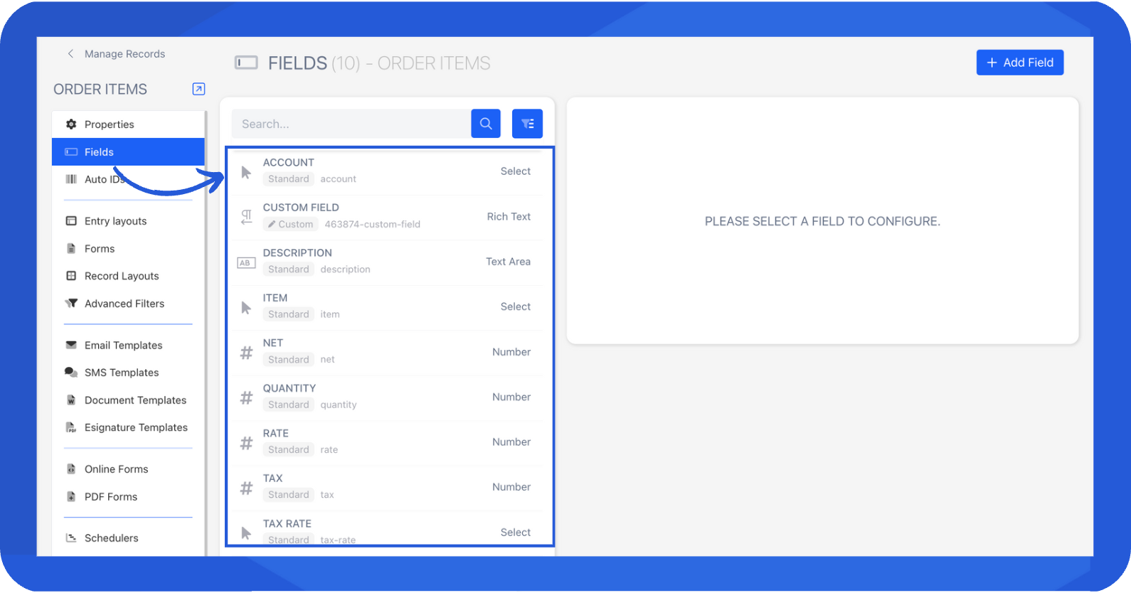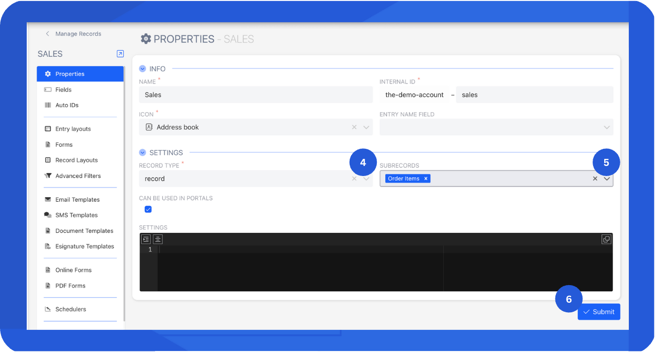 - In the Sub-records section, add the sub-record you created (e.g., Order Items).
