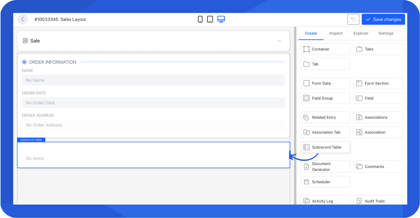- Drag and drop a Sub-records component into the layout. Adjust placement as needed.
