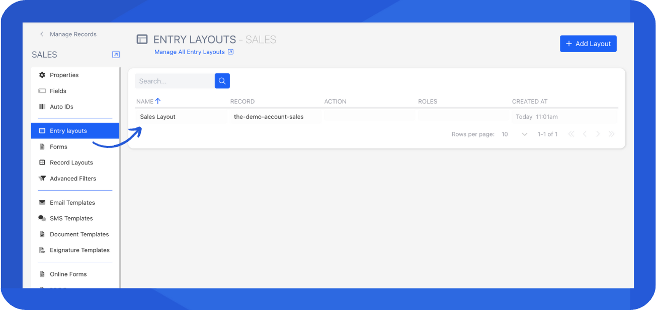 - Go to Entry Layout in the side navigation. Select the existing layout you use.