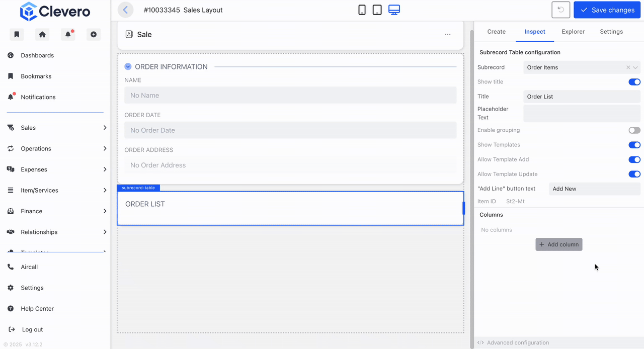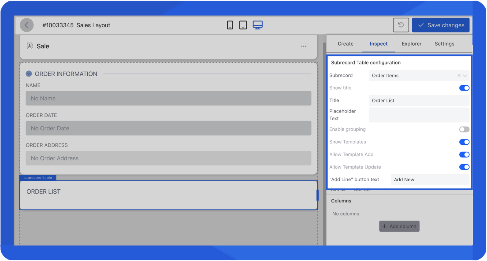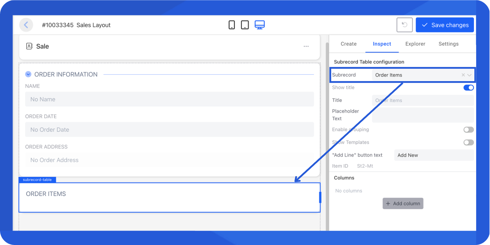 - In the Inspect tab, select the sub-record you just created (e.g., Order Items).