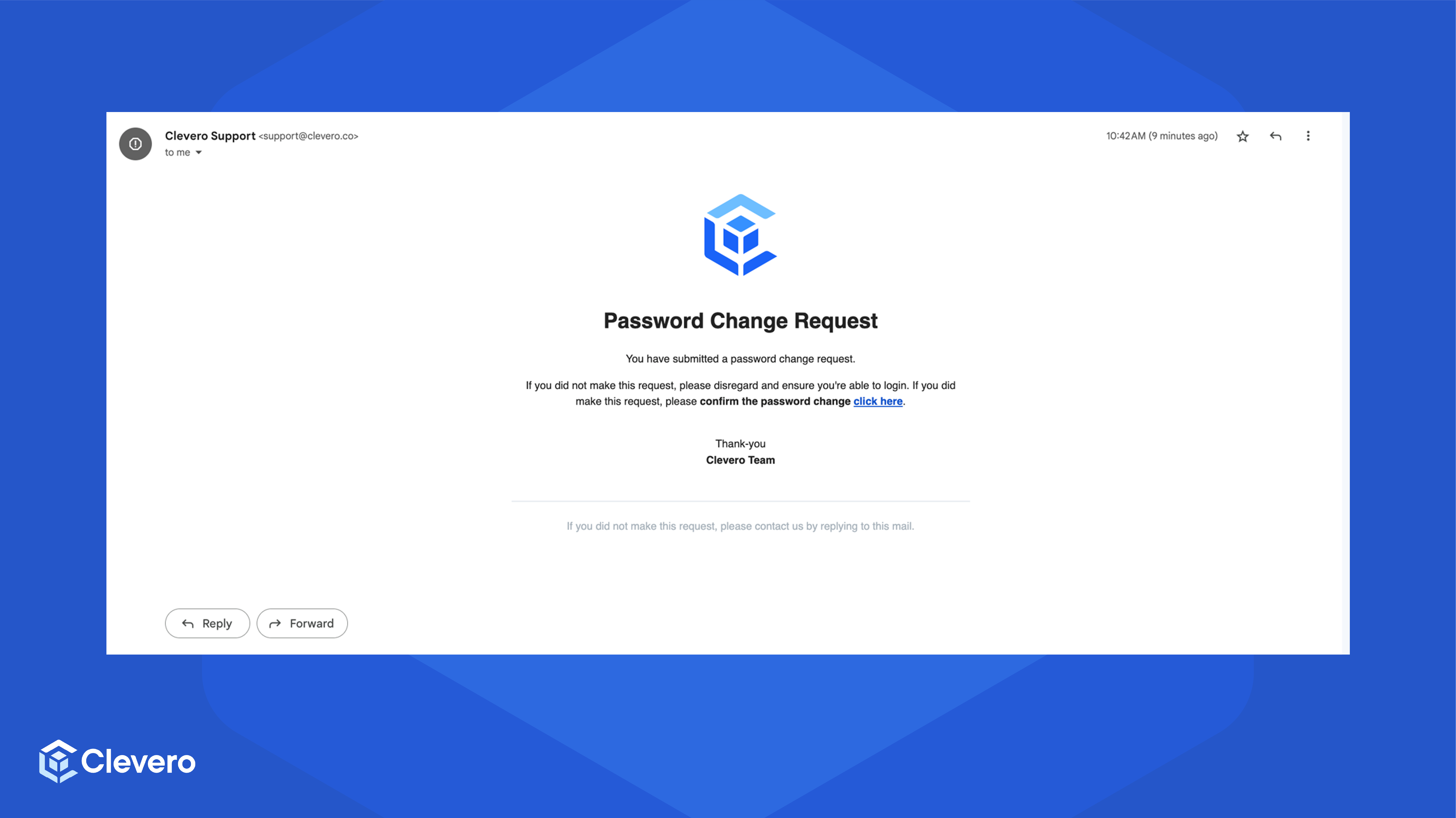 The "Reset Password" feature in Clevero allows users to reset their passwords in case they forget. Follow the steps below to reset the password: